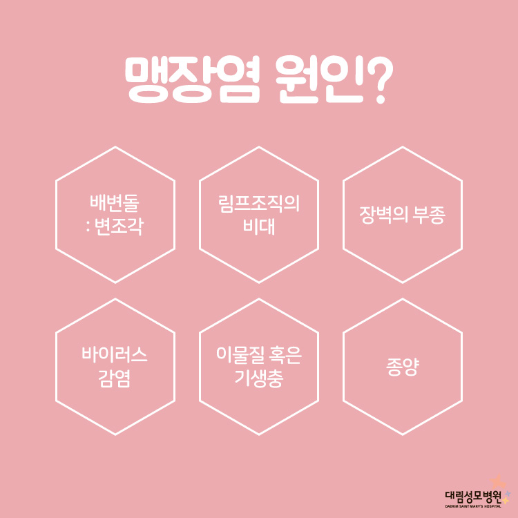 맹장염의 정확한 원인은 아직 밝혀지지 않았지만, 대부분 충수돌기의 입구가 막히면서 시작됩니다.