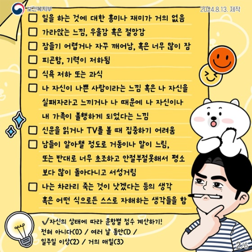 하지만 우울증 자가진단 은 전문가의 진단을 대체할 수 없다는 점을 명심해야 합니다.