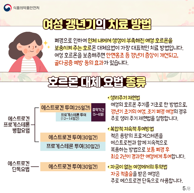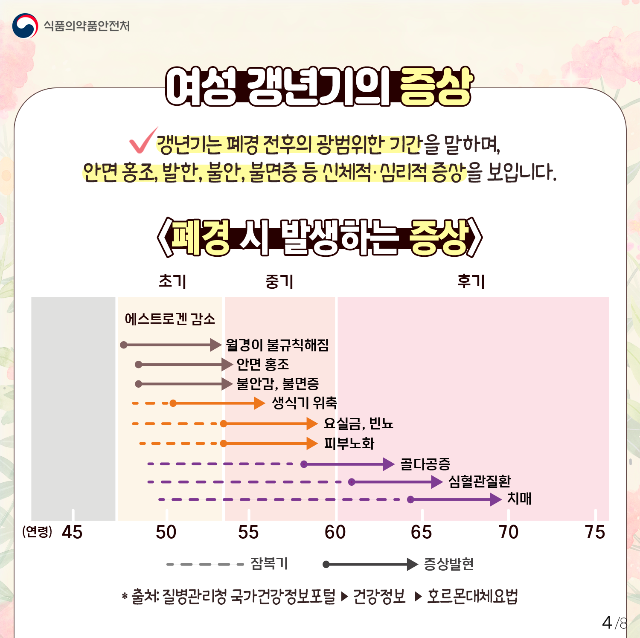 - 기간: 폐경 이행기부터 마지막 생리 후 1년까지의 기간을 포함하며, 평균 4~7년 정도 지속됩니다.
